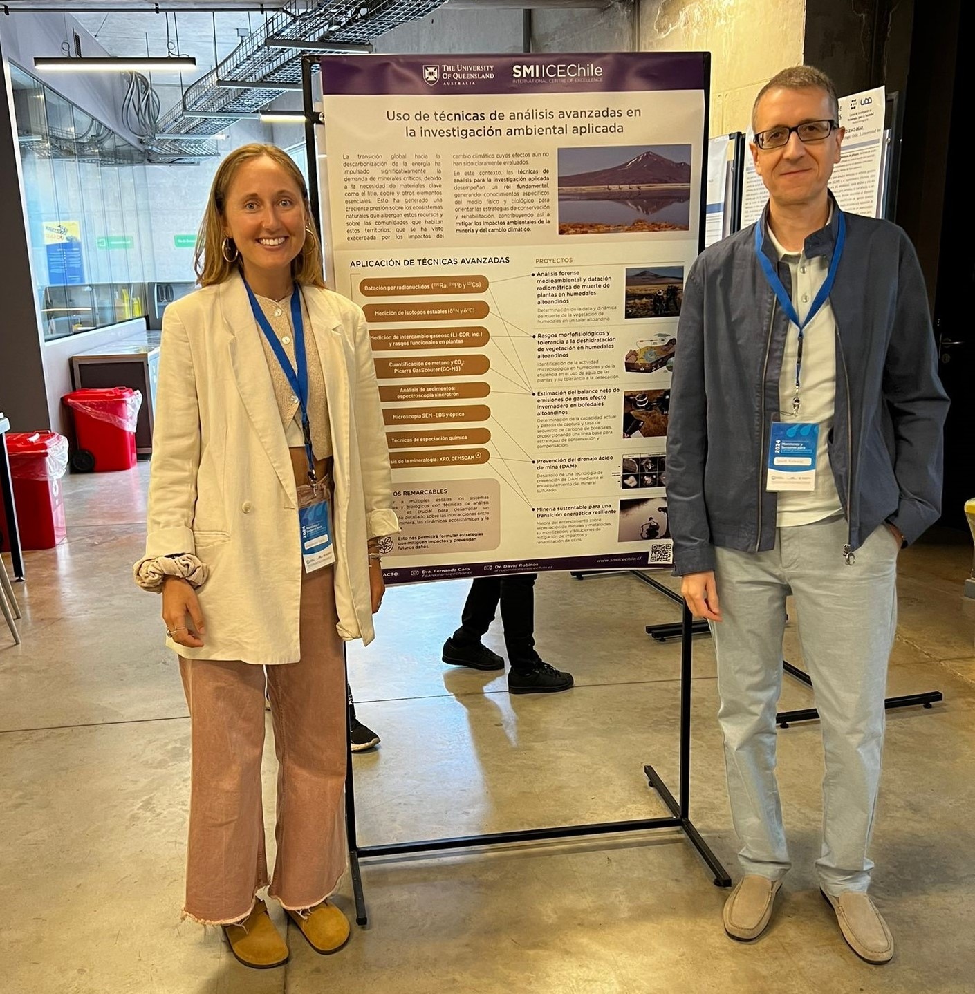 SMI-ICE-Chile also had a very active and visible presence through a corporate stand with graphic pieces about the work carried out by the Center. In this context, Dr. Fernanda Caro Beveridge and Dr. David Rubinos, researchers in the area of Environmental Rehabilitation, developed a poster on the use of advanced techniques in applied environmental research, a crucial aspect to develop a robust understanding of the interactions between mining activity, ecosystem dynamics and human health. “This allows us to formulate strategies that mitigate impacts and prevent future damage,” explain both scientists.